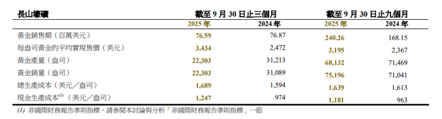 截至2025年9月30日止三個月,長山壕礦的黃金產量減少18%至22,303盎司,而2024年同期則為31,213盎司。截至2025年9 月30日止三個月的黃金總生產成本增加至每盎司1,689美元,而2024年同期則為1,594美元。截至2025年9月30日止三個月的 黃金現金生產成本相較2024年同期每盎司974美元增加至1,247美元。