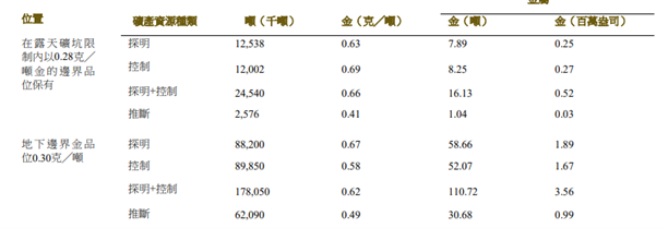 根據以下參數,就露天採礦而言,礦產資源按邊界金品位0.28克╱噸呈報;堆浸及冶金回收率為60%,金錠市價為每盎司1,980美元。 根據以下參數,地下礦塊崩落採礦的額外礦產資源按邊界金品位0.30克╱噸呈報:堆浸及冶金回收率為60%,金錠市價為每盎司1,980 美元。於2022年4月,1.0000美元=人民幣6.3457元,一金衡製盎司等於31.1035克。