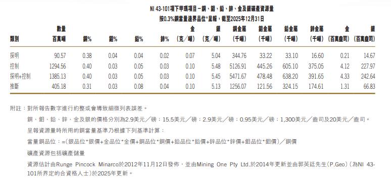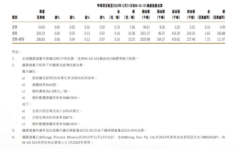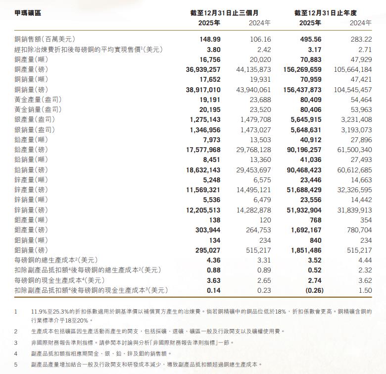 2025年甲碼礦銅產量由2024年同期的105.7百萬磅(約47,929噸),增加48%至156.3百萬磅(約70,883噸)。