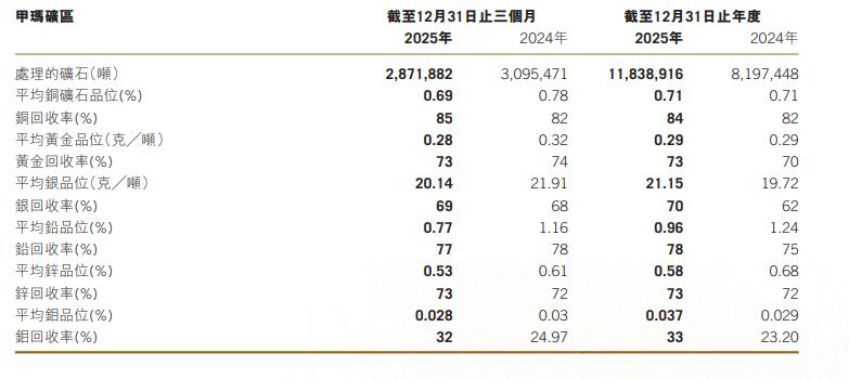 於截至2025年12月31日止三個月,甲瑪礦區的銅産量爲16,756噸(約37.0百萬磅),較2024年三個月同期的20,020噸(約44.1百萬磅)有所減少。